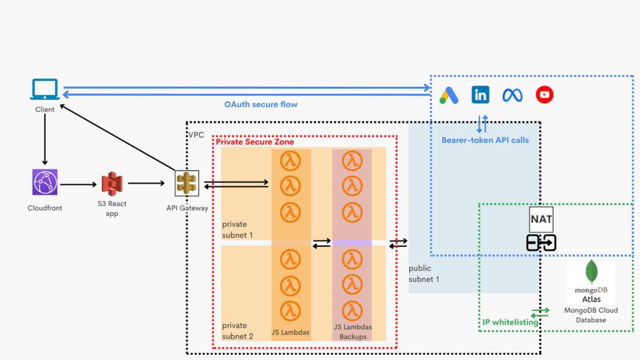 - OAuth keys are encrypted at rest and in transit, stored in MongoDB accessible only via backend IPs.